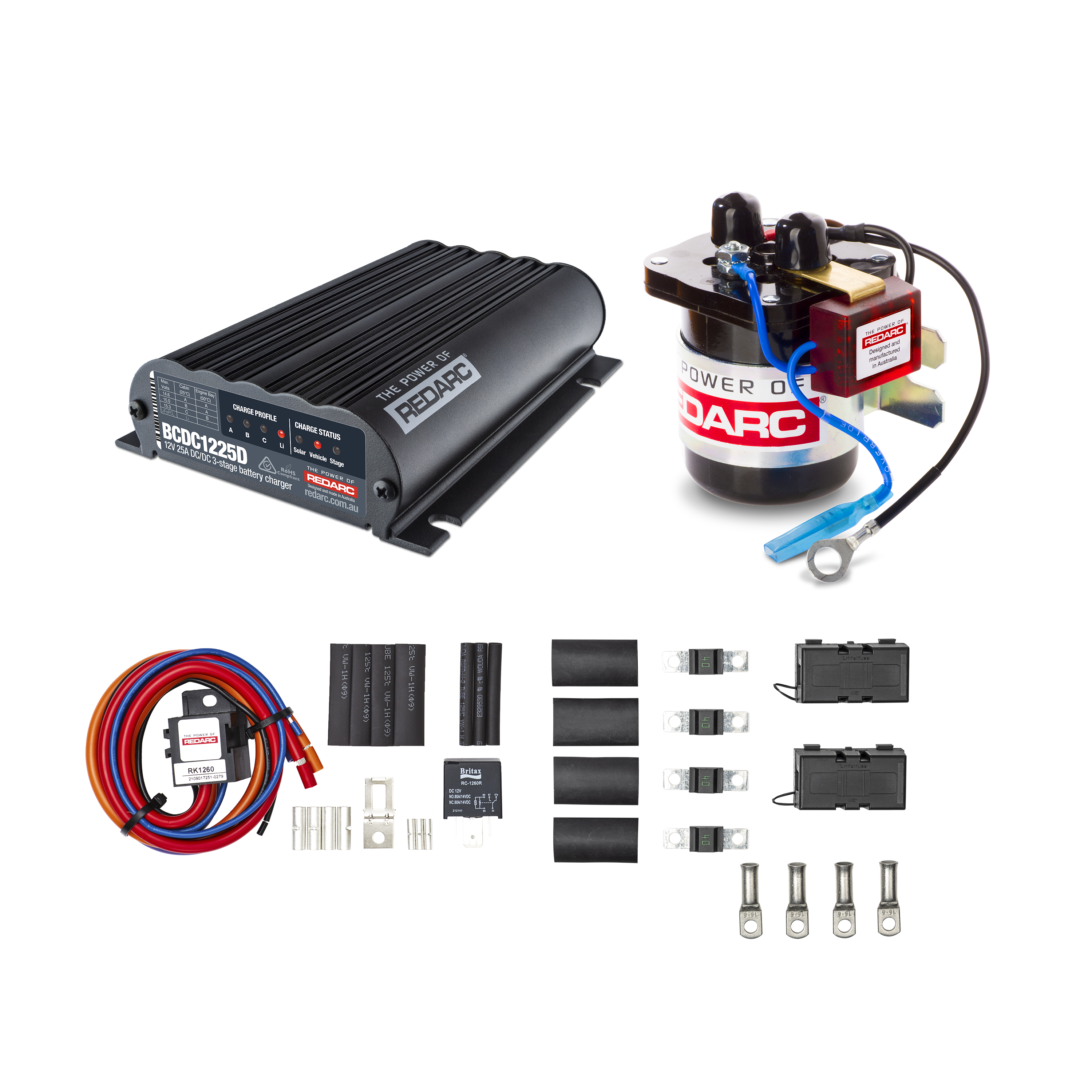 - A 25amp DC to DC battery charger (BCDC1225D) to connect and charge your batteries