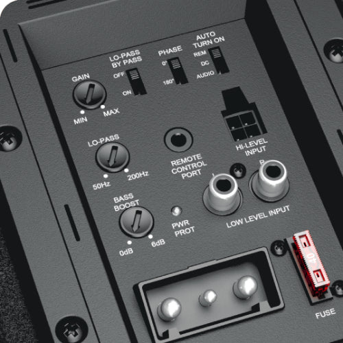 The Butterworth low pass filter at 12dB/Oct. with variable cut-off frequency (50-200 Hz) can be bypassed when used with an external processor with pre-out output dedicated to the sub. The adjustable bass-boost control (0 ÷ 6 dB) at 45 Hz allows the user to emphasize the response on the lower side of the spectrum and the Phase control (0 - 180°) completes the equipment. The high-level speaker-in input on the multi-pole connector eases the integration with OEM audio systems while the low-level input on RCA is dedicated to the connection with after-market sources.