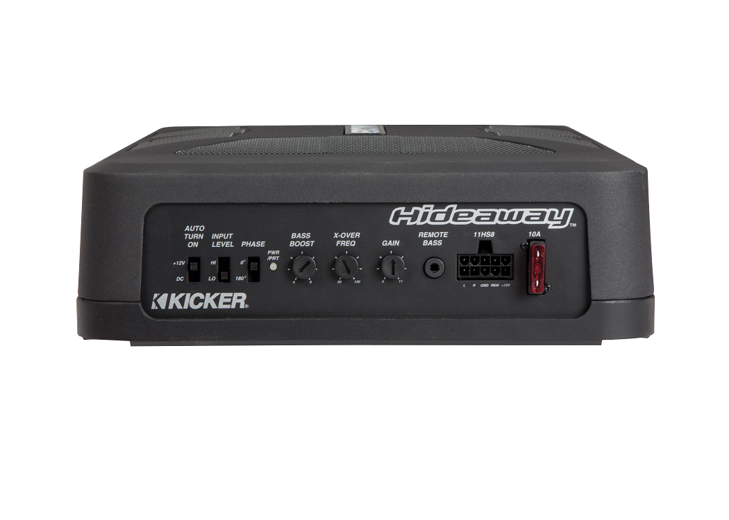 The KICKER Hideaway Compact Powered Subwoofer delivers surprising low frequency output from a remarkably small enclosure, setting a new standard in plug-and-play bass performance and convenience in a vehicle. At just over three inches high and nearly 14 inches long, the Hideaway combines a 150-watt amplifier and an 8-inch subwoofer to add thumping bass to any vehicle from the tightest locations. It also provides a quick-connect power plug and Velcro®-fastened nylon straps for secure installation and simple but fast removal.